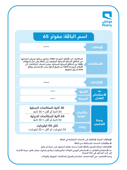 مكالمات الأرقام الموحدة 9200 مجانية وسيتم احتسابها من الدقائق المحلية المجانية في الباقة، وفي حال استهلاك 100% من الدقائق المجانية، سيتم احتساب المكالمات عن طريق الدفع حسب الاستخدام بقيمة 0.1495 ريال للدقيقة.
